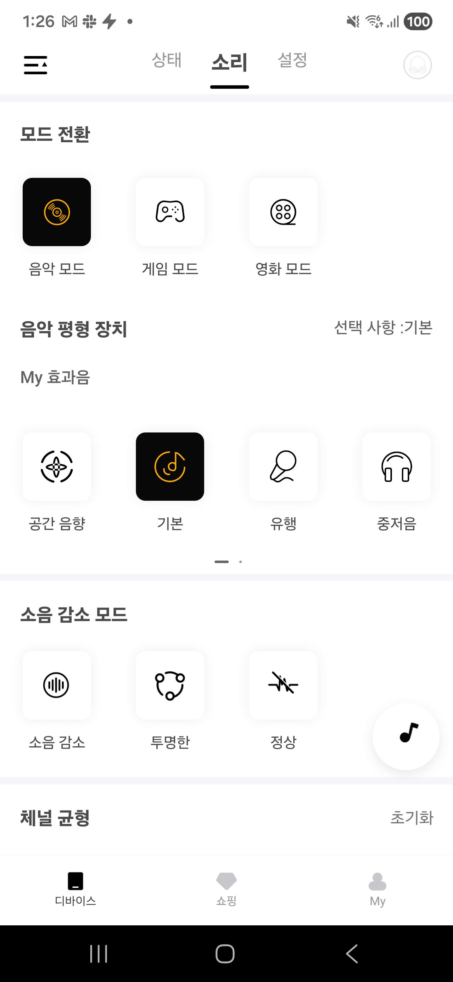 음악모드에서는 공간음향 부터 사용자 지정까지 이퀄라이즈를 변경 할수 있습니다.